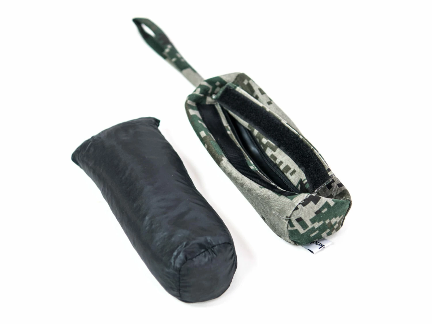Dieser Textildummy mit Handschlaufe in Tarn-Optik, hat eine clevere Doppelfunktion. Die FĂŒllung (schwimmfĂ€hig) kann entnommen werden.