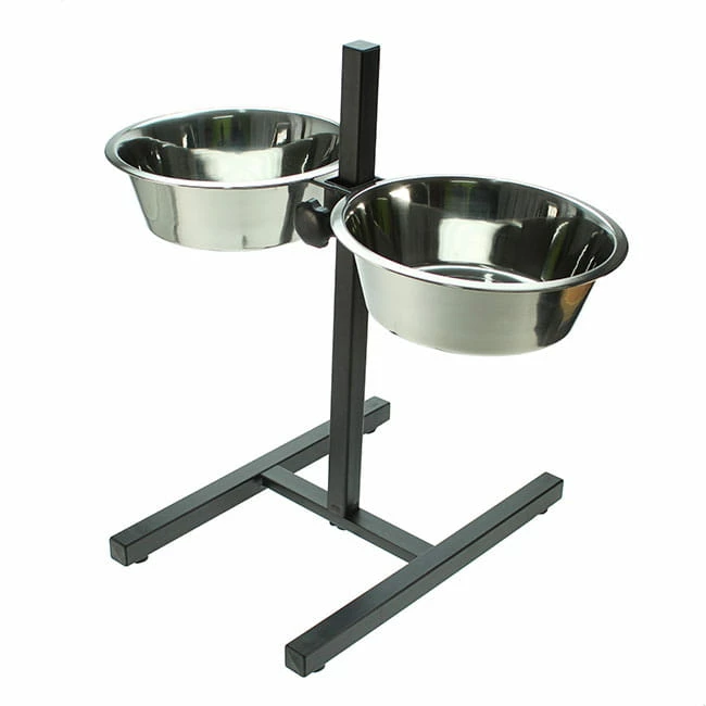 Die Näpfe sind aus rostfreiem Edelstahl und die Verstellhöhe beträgt ca. 50 cm. Der Ständer ist schwarz lackiert.