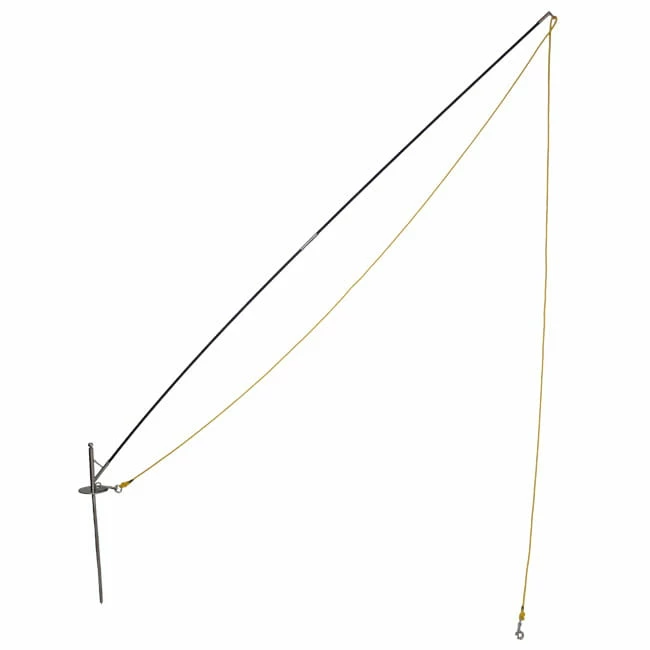 Bei dieser Treibangel ist eine Leine am ErdspieĂ an einem Ring befestigt. Diese wird ĂŒber einen flexiblen Stab nach oben gefĂŒhrt.Â