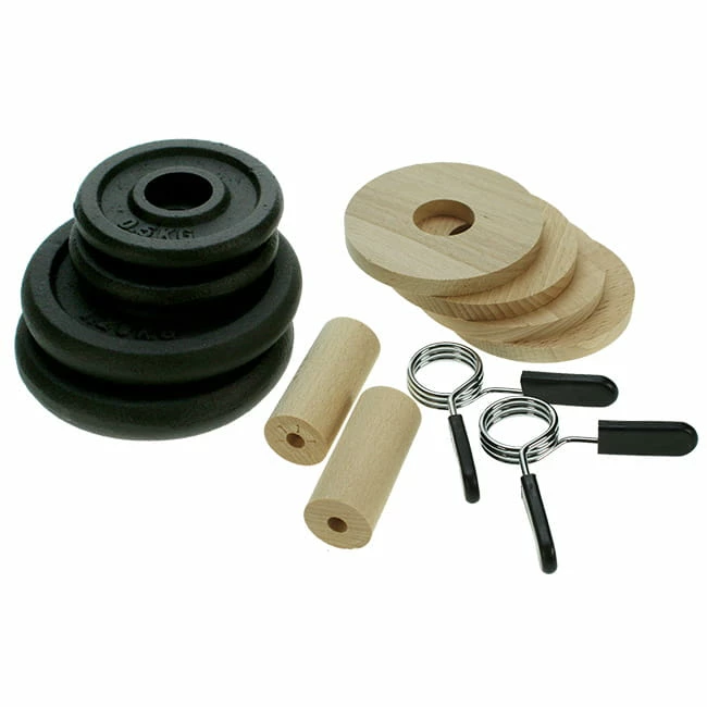 Im Lieferumfang sind neben 4 Distanzscheiben aus Holz, je 2 vernickelte Stahlscheiben mit 0,5 kg und 1,25 kg enthalten.