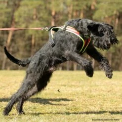 Es ist in der Grundkonzeption den Geschirren von Schlittenhunden ähnlich.Zusätzlich hat es einen großen Handgriff zum Halten des Hundes. Robuste und komfortable Materialien (Neopren, PTM und Gurtband) wurden bei der Herstellung verwendet. Das Hundeführergeschirr hat einen Rundring an der Oberseite zur Leinenaufnahme. Ein großer, robuster Steckverschluss am Bauchgurt sorgt für individuelle Einstellmöglichkeiten. Das Hundeführergeschirr Follow wird höchsten Ansprüchen gerecht, ist federleicht, pflegeleicht und nimmt kein Wasser auf.
