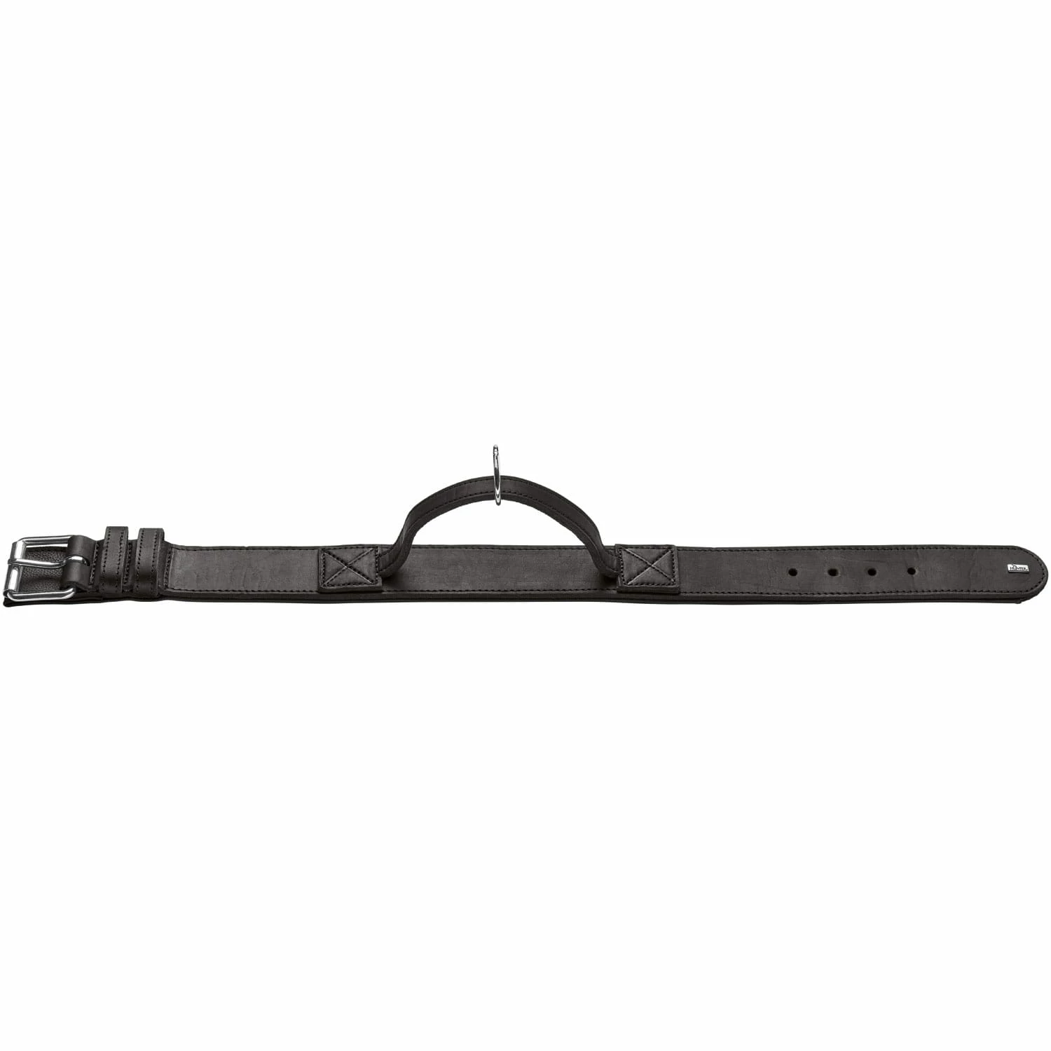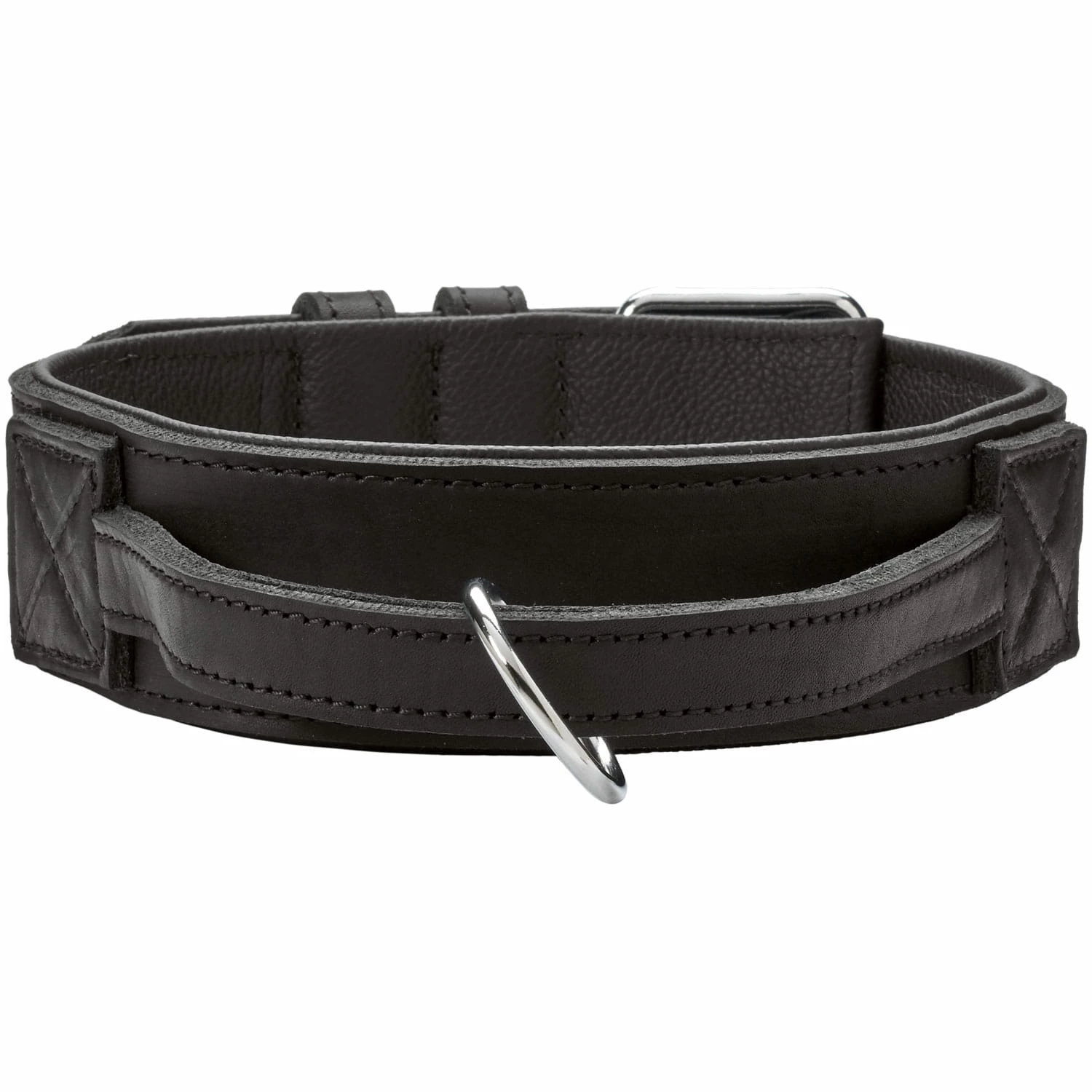 Das breite Band ist mit Nappaleder unterlegt und so sehr angenehm zu tragen. Im Handgriff ist ein O-Ring eingefÀdelt, an dem sich auch eine Hundeleine einhaken lÀsst. Das Halsband ist 4,8 cm breit und in verschiedenen LÀngen lieferbar.