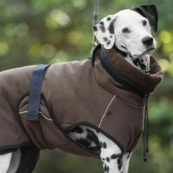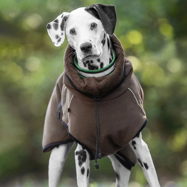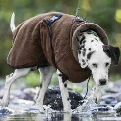 Lege deinem nassen Hund die Frotteeseite auf. Das Baumwollfrottee leitet das Wasser vom Hund weg und saugt die Feuchtigkeit auf, sodass der Hund schnell trocknet. Nach etwa 30 Minuten kannst du das Cape wenden und die wĂ€rmende Fleeceseite auflegen. Eine Membrane zwischen dem Frottee und dem Fleece verhindert, dass die NĂ€sse durchschlĂ€gt. Der GĂŒrtel ist mit einem verstellbaren Klipp versehen, so dass die Bachumfangsweite mĂŒhelos angepasst werden kann.